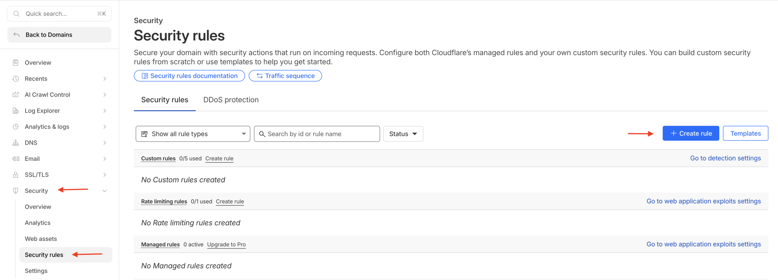 - Set up DDoS protection – Prevents large-scale attacks that try to overwhelm your site.