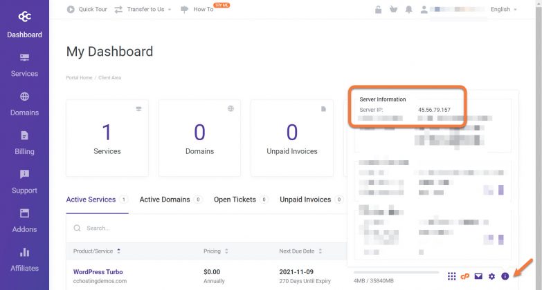 To learn more, we published an easy guide explaining how to locate your Server IP Address inside of Client Area here.