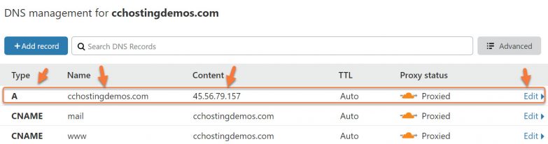 Step 2: Your DNS Management area for the domain will open and a list of your DNS records will be displayed. Let’s use the example below as a reference: