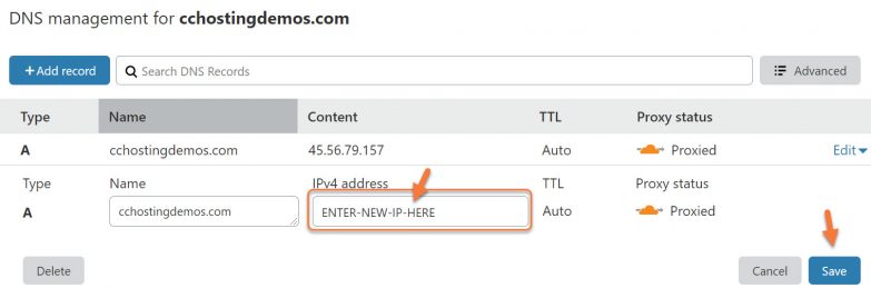 After clicking Edit, the record will expand and you will be given the option to enter the new Server IP Address of the server on which your account resides at ChemiCloud.