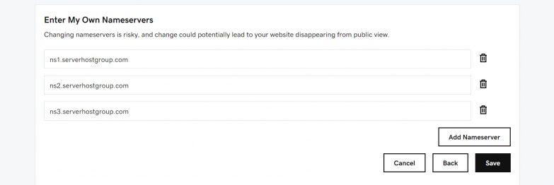 The page will change and you will have the option to enter your nameservers. Be sure to click Add Nameserver to add the third nameserver.