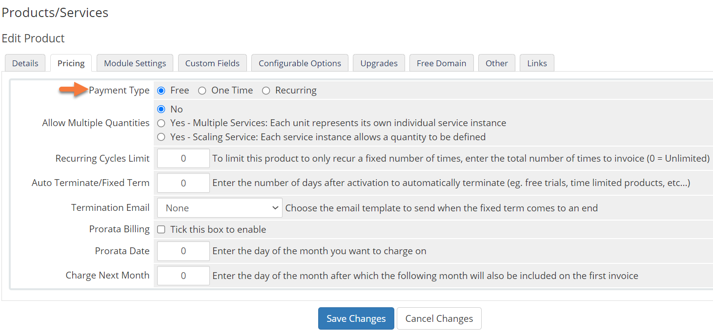 The Payment Type setting allows you to control whether the subscription for this product will be free, a one time fee, or a recurring charge.