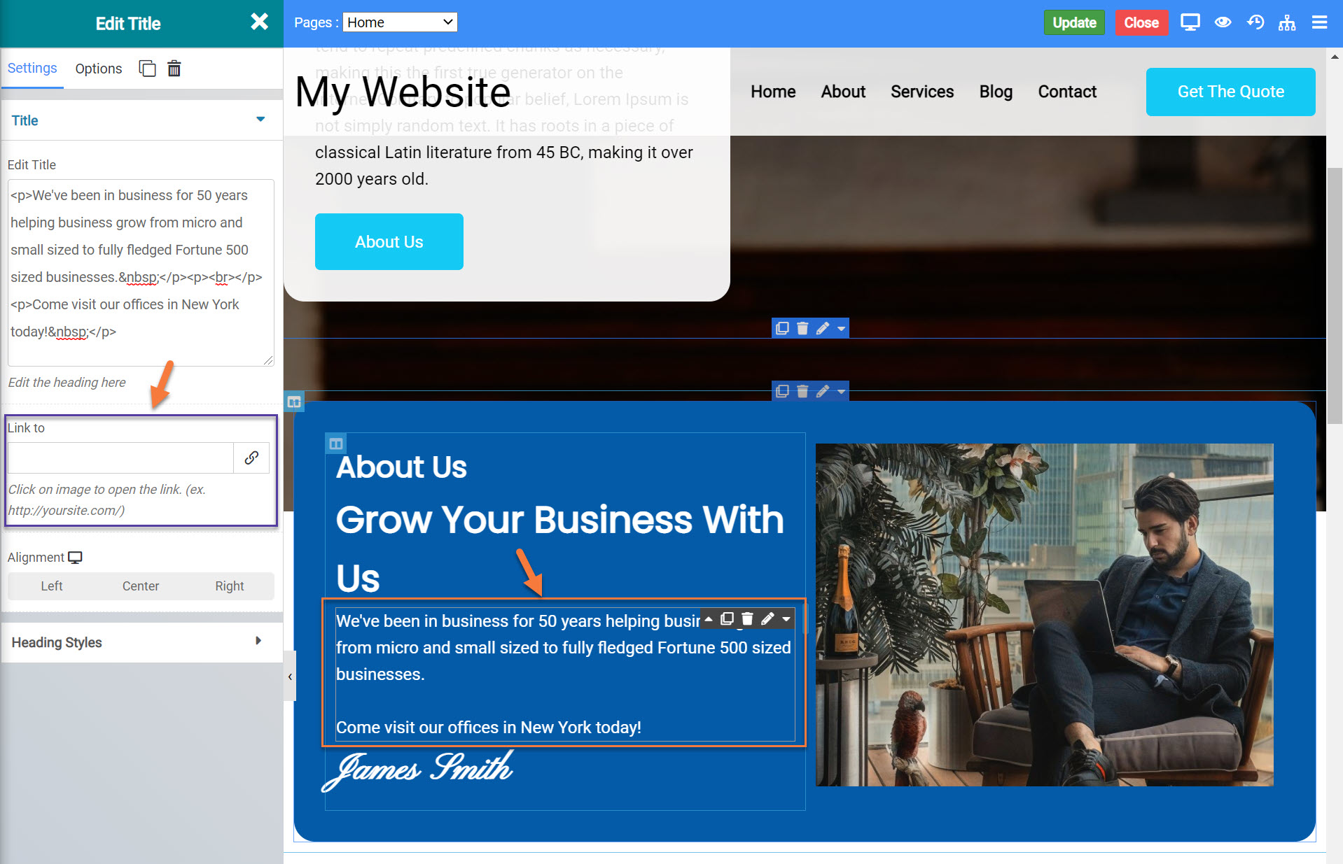 Choose the page which will have a link to a page or content on another site and click the pencil icon after hovering over that page to open the Website Editor. I’m going to use the About Us section on my Home page for this.