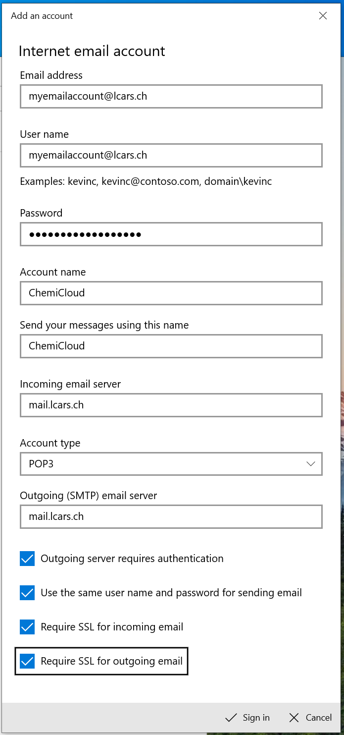 Finally, to the last 3 fields and the 4 checkboxes, you will want to enter your mail server information. If your mail is hosted by ChemiCloud, it will be similar to the following: