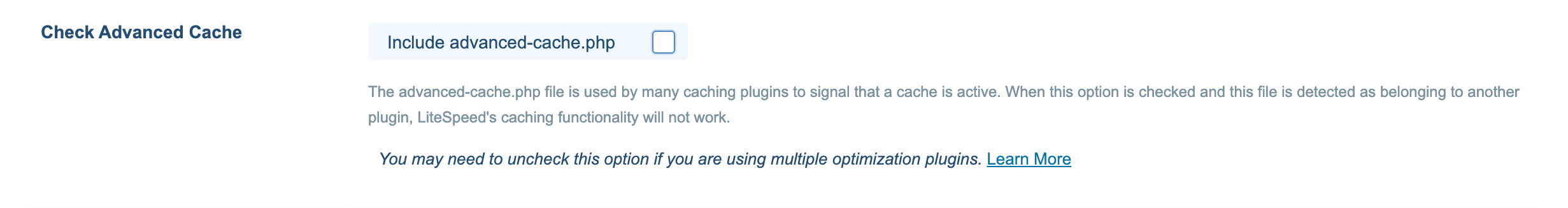 Navigate to Settings → LiteSpeed Cache → Advanced, and uncheck the “Include advanced-cache.php” option.
