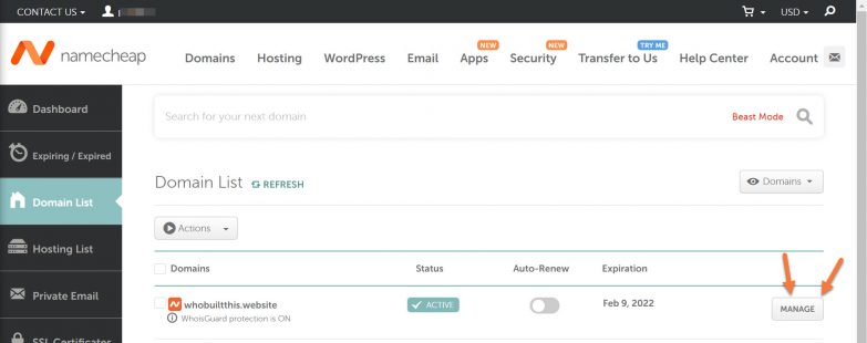 2) On your Namecheap Dashboard, look for the menu on the left and click Domains List.