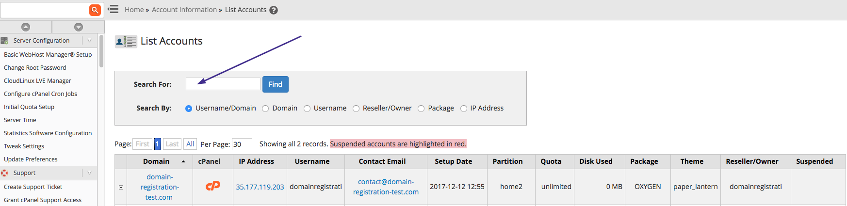 4) You can also use the Search function to look for a specific account for easier navigation, you can search by domain, username, IP, package or owner.