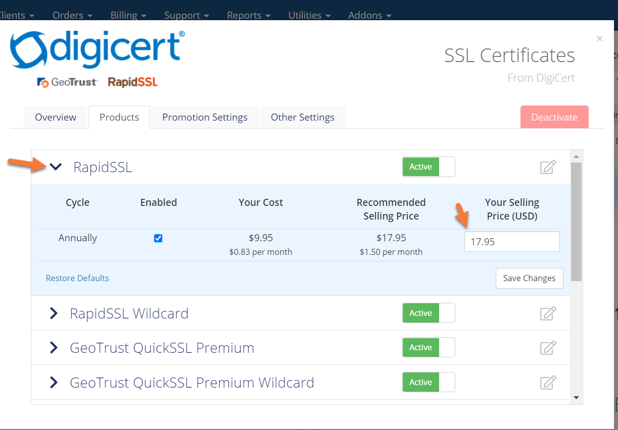 Step 4: For our example, we’ll be setting pricing for our DigiCert SSL Certificates. Click the Products tab. The list of different SSL Certificates you can sell will be presented. Click the > icon next to the SSL for which you want to adjust the price and that product will expand and you will be able to set the pricing: