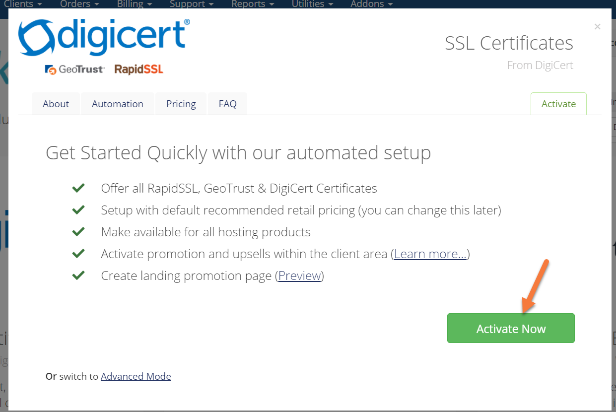 Once you click Start Selling, a modal will appear and all you need to do is click the green Activate Now button to add the selected item to your WHMCS installation as an item you can sell to customers, if you choose.
